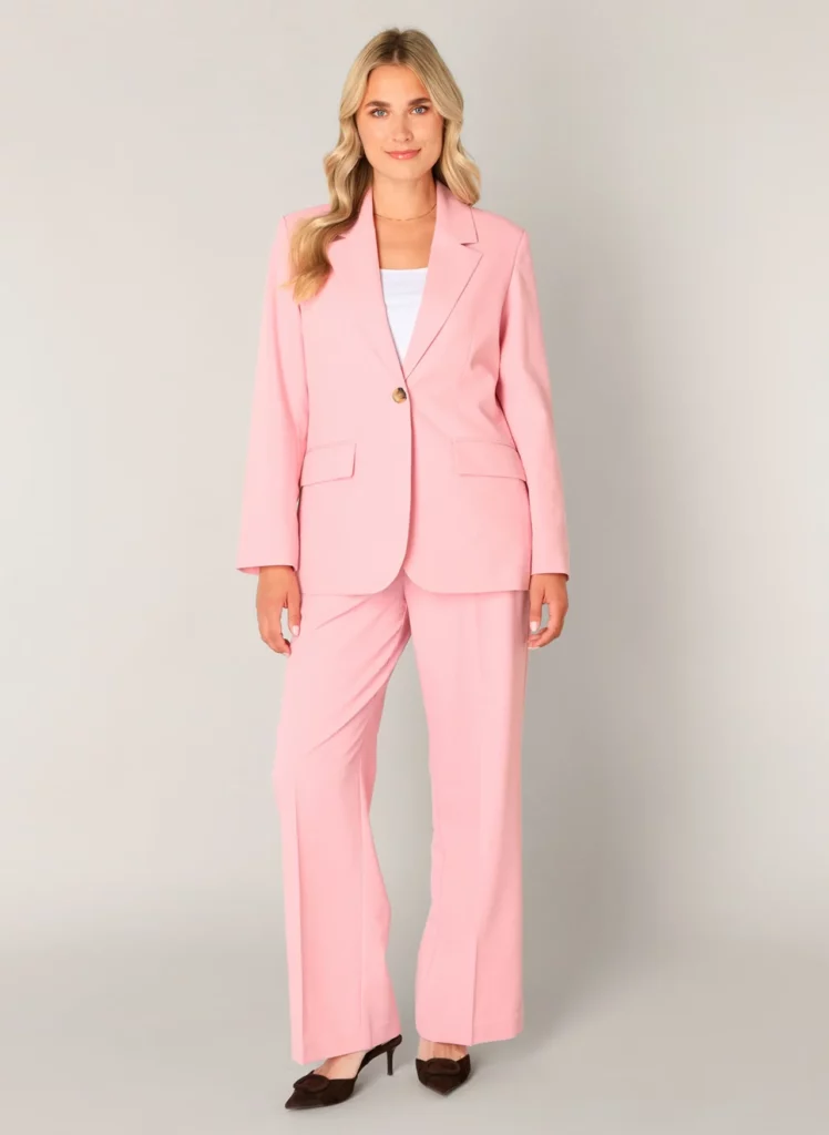 Blazer in zachtroze, ontworpen met vulling in de schouders en zakken aan de voorkant voor een gestructureerde, verzorgde look. De strakke snit geeft elke outfit een verfijnde uitstraling.