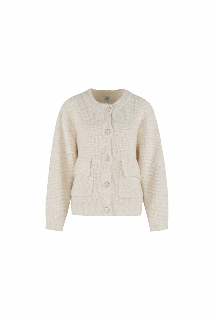 De Charlotte Knitted Cardigan van C&S The Label is een grofgebreid vest in het Wool White. Dit vest heeft lange mouwen, een Ronde-hals en heeft 5 knopen (Broches) in goud kleur.