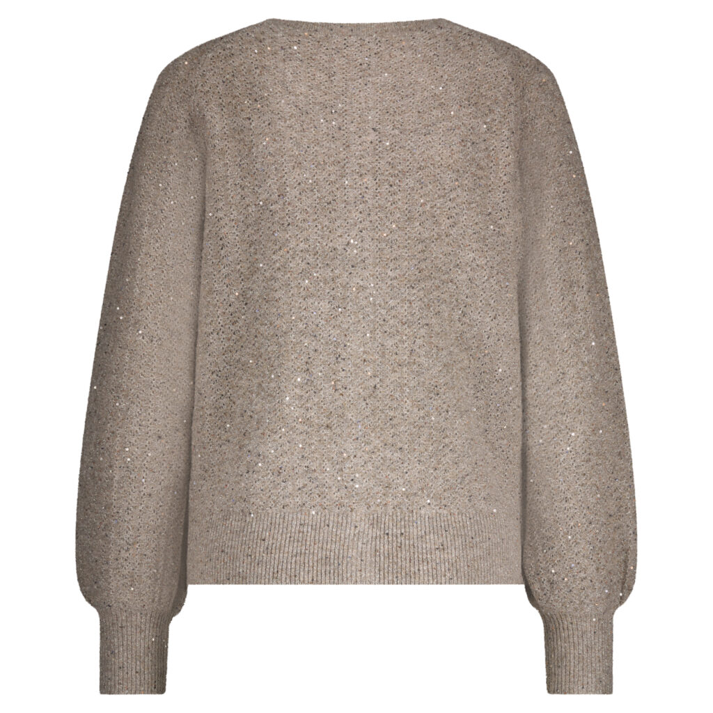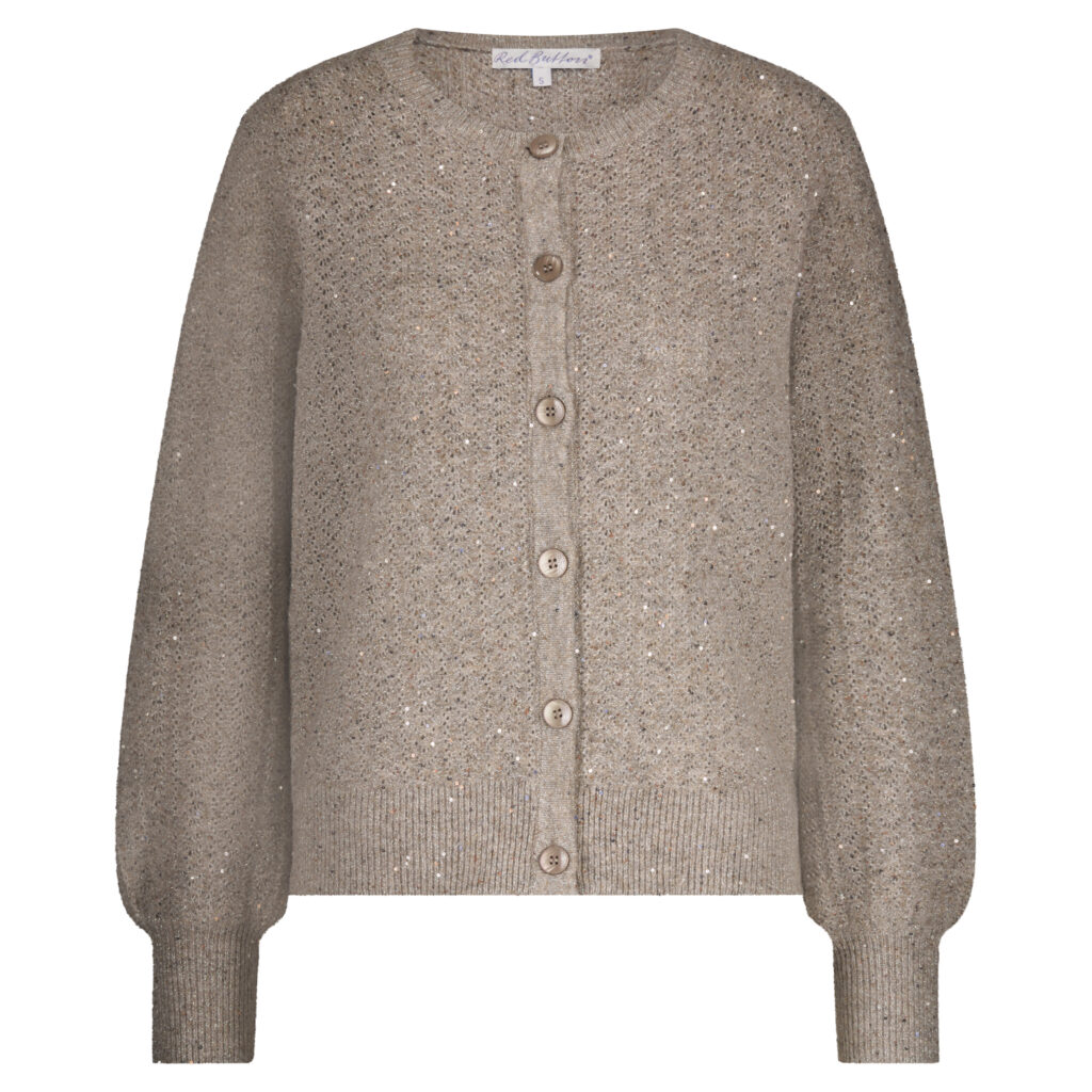 De Cardigan Ajour Sparkle is een ajour gebreid vest met een ronde hals en een knoopsluiting aan de voorkant. Er zit een glitter door het breisel en het vest heeft geribde boorden. Verkrijgbaar in de kleuren sparkle truffle & stone.