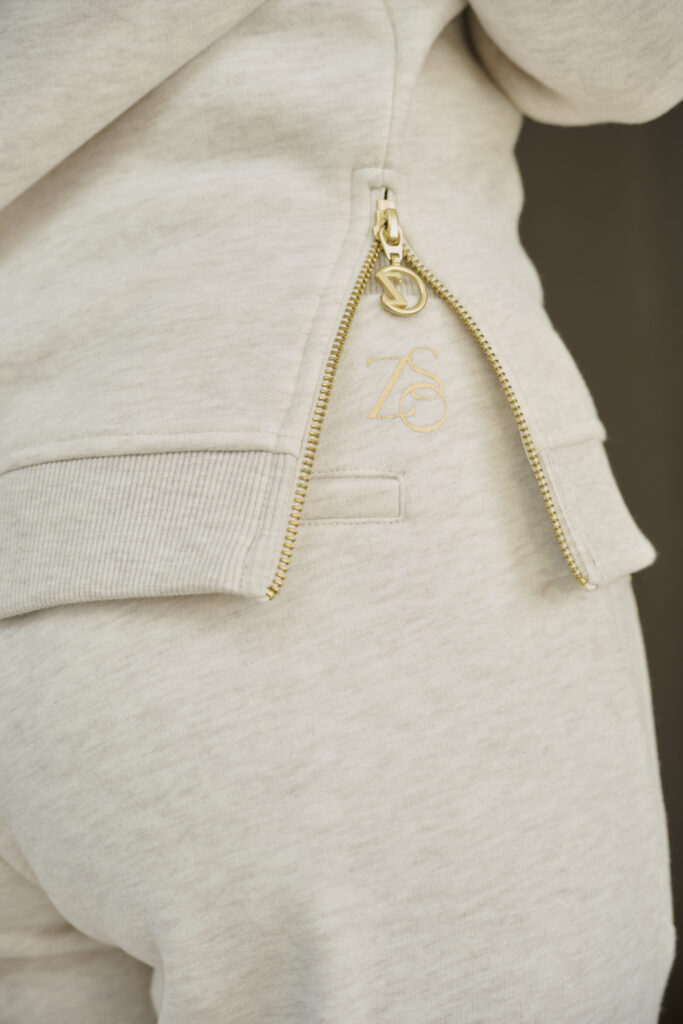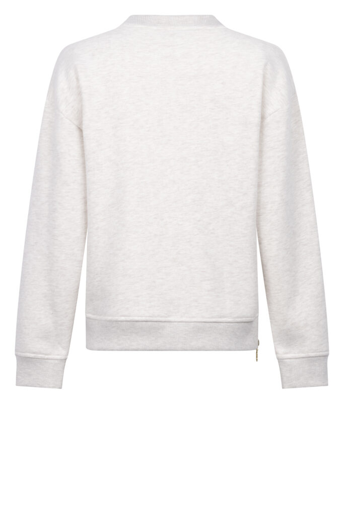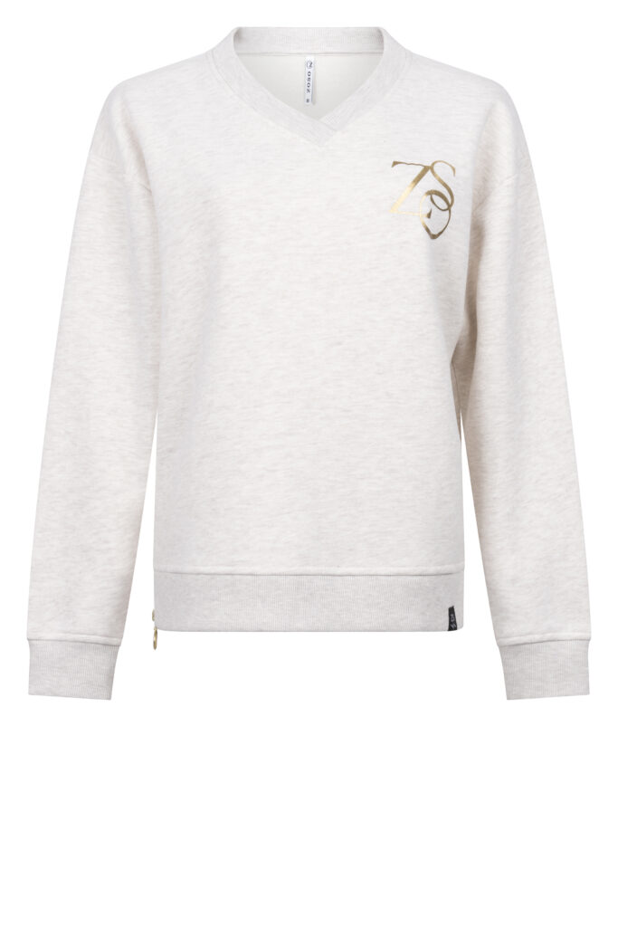 Sweater Wendy Sand Melange van Zoso is een zachte comfortabele sweater met V-hals en lange mouwen. Met een opvallende Gouden opdruk op de voorzijde.