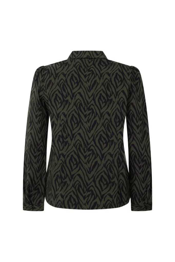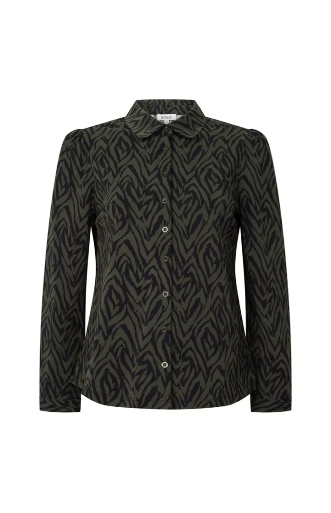 Blouse Jasmine Army Navy van Zoso heeft een stijlvolle zebraprint in donkergroen en navy. Het model heeft een klassieke kraag, lange mouwen en een doorlopende knoopsluiting