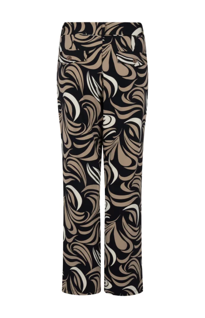 De Zoso Edith Printed Flair Travel Pants in Black/Camel is een modieuze broek van comfortabele travelstof met stretch. De broek heeft een flatterend flared model en een stijlvolle print in zwarte en camel tinten. Kreukvrij, ademend en perfect voor een trendy, maar comfortabele look – ideaal voor zowel werk als vrije tijd.